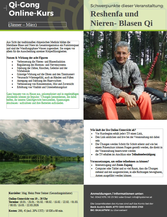 Aus Sicht der TCM bilden Körper, Emotionen, Bewusstsein und auch die Funktionskreisläufe (Holz, Feuer, Erde, Wasser und Metall) eine Einheit. In diesem Kurs werden Übungen vorgestellt, die auf die diese Bausteine Einfluss nehmen können. Dabei wird mit Bewegung und Vorstellung gearbeitet.